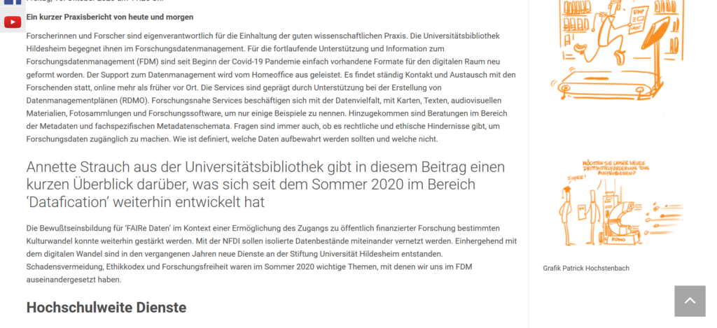 Forscherinnen und Forscher sind eigenverantwortlich für die Einhaltung der guten wissenschaftlichen Praxis. Die Universitätsbibliothek Hildesheim begegnet ihnen im Forschungsdatenmanagement. Für die fortlaufende Unterstützung und Information zum Forschungsdatenmanagement (FDM) sind seit Beginn der Covid-19 Pandemie einfach vorhandene Formate für den digitalen Raum neu geformt worden. Der Support zum Datenmanagement wird vom Homeoffice aus geleistet. Es findet ständig Kontakt und Austausch mit den Forschenden statt, online mehr als früher vor Ort. Die Services sind geprägt durch Unterstützung bei der Erstellung von Datenmanagementplänen (RDMO). Forschungsnahe Services beschäftigen sich mit der Datenvielfalt, mit Karten, Texten, audiovisuellen Materialien, Fotosammlungen und Forschungssoftware, um nur einige Beispiele zu nennen. Hinzugekommen sind Beratungen im Bereich der Metadaten und fachspezifischen Metadatenschemata. Fragen sind immer auch, ob es rechtliche und ethische Hindernisse gibt, um Forschungsdaten zugänglich zu machen. Wie ist definiert, welche Daten aufbewahrt werden sollten und welche nicht.